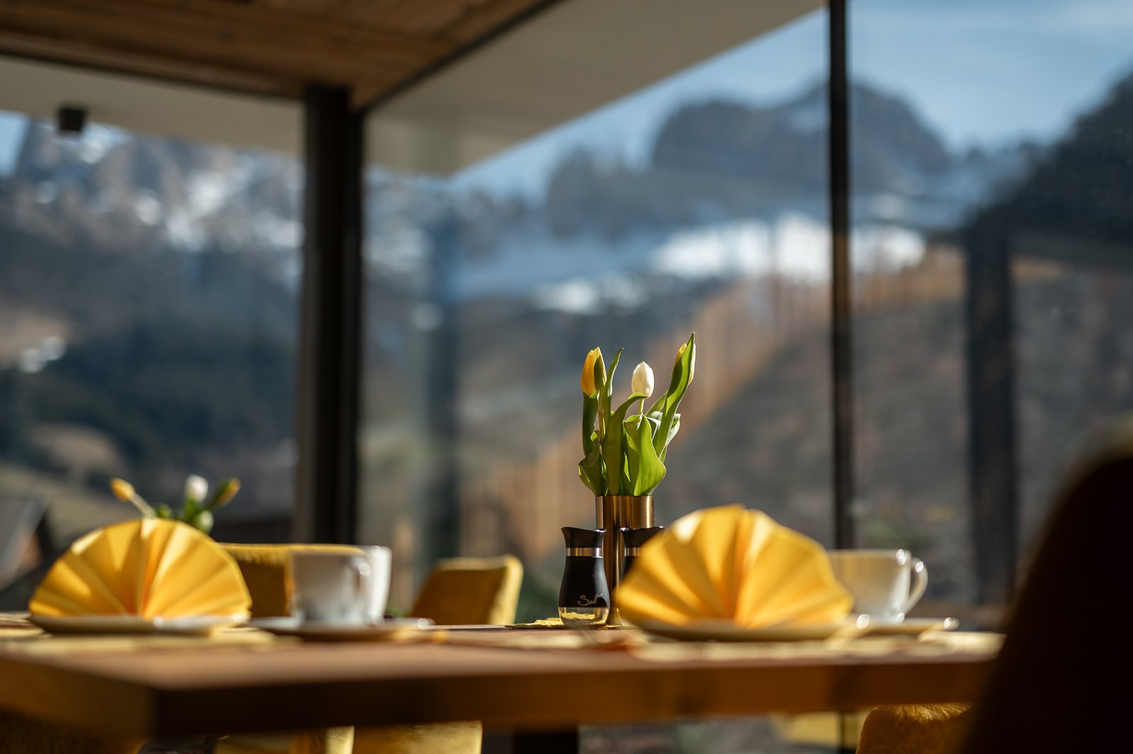 Beginnen Sie mit einem herzhaften und liebevoll zubereiteten Frühstücksbuffet den Tag. Genießen Sie in unserem gemütlichen hellen Frühstücksraum ein zauberhaftes Bauernfrühstück mit Blick auf das sagenhafte Rosengartenmassiv.